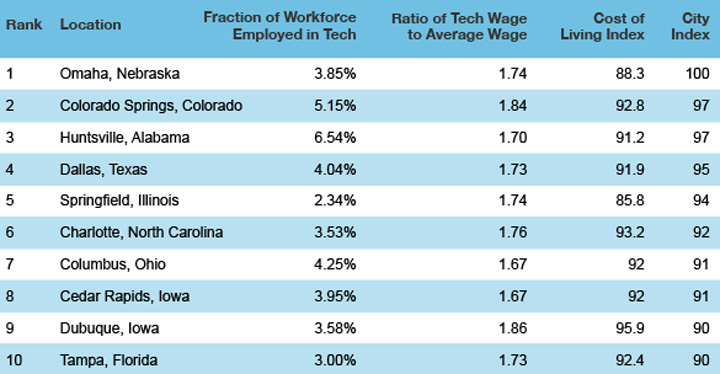 Omaha, Neb., took top honors as the best city for tech workers for several reasons. “The costs of living there are a mere 88.3 percent of the national average, 3.8 percent of all Omaha workers are tech employees, and those tech workers make 74 percent more than the city average,” the article notes. The city is also home to five Fortune 500 companies: Berkshire Hathaway, food manufacturer ConAgra, train operator Union Pacific, construction company Kiewit, and insurance firm Mutual of Omaha.