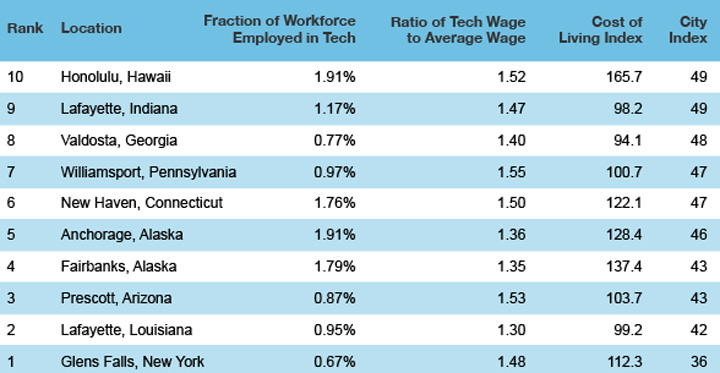 The list selections are based on data from the federal Bureau of Labor Statistics and the Census Bureau, including factors such as the average wage all workers in the area earn, the average wage for tech workers, the percentage of all workers employed in tech and the cost of living index for 200 cities.
