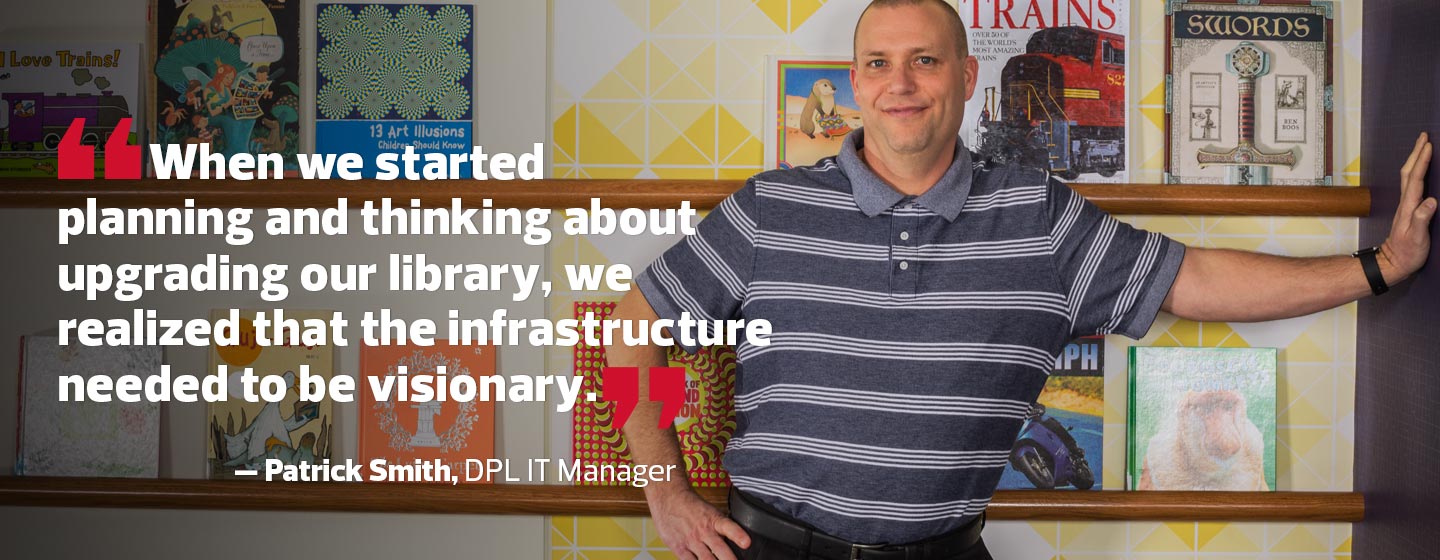 “When we started planning and thinking about upgrading our library, we realized that the infrastructure needed to be visionary,” says Patrick Smith, DPL IT Manager. “That meant building a foundation that could handle not just the latest technology that we wanted to put in place on opening day, but also whatever technology innovations came along over the next 20 years.”