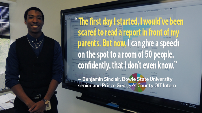 Meet Benjamin Sinclair. He’s a senior and a computer science technology major at Bowie State University. After spending the summer with Prince George’s County’s Office of Information Technology Summer Youth Enrichment Program, he has been offered an extended internship and has been given the opportunity to lead the implementation of a solution from Splunk, a Big Data software provider.