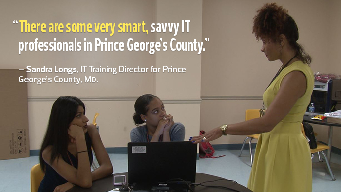 “We set out to connect with the next generation, the youth that’s going to come in and run IT at some point,” says Sandra Longs, IT training director for the county. “We try to go out and get the IT talent, to use the technology with some of the vexing problems confronting Prince George’s County, and those issues include low-income, foreclosure homes, health issues, high dropout rates in schools and poor test scores.”